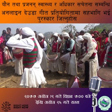 CDS-Park, Mugu ले युवाहरुको यौन तथा प्रजनन् स्वास्थ्य र अधिकार सुनिश्चितताको लागि कर्णाली प्रदेश क्षेत्र भित्र रहेर विभिन्न कार्यक्रमहरु गर्ने सन्दर्भमा अनलाइन खुल्ला देउडा गीत प्रतियोगिता गर्ने भएकोले उक्त प्रतियोगितामा सहभागि भै पुरस्कार जित्न यो सूचना प्रकाशित गरिएको छ ।